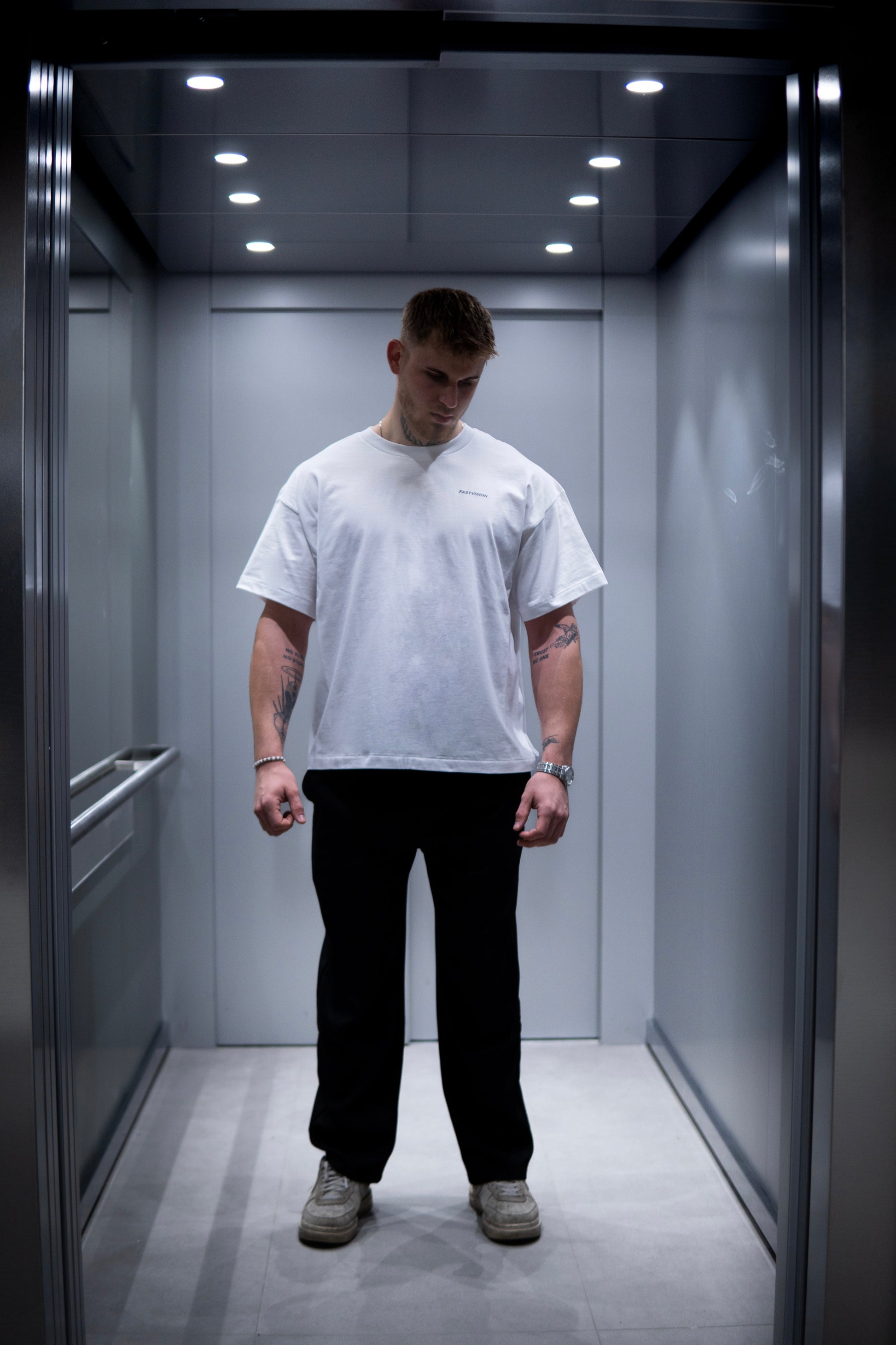 - Das Model mit einer Größe von 192cm & einem Gewicht von 89kg trägt Größe XL